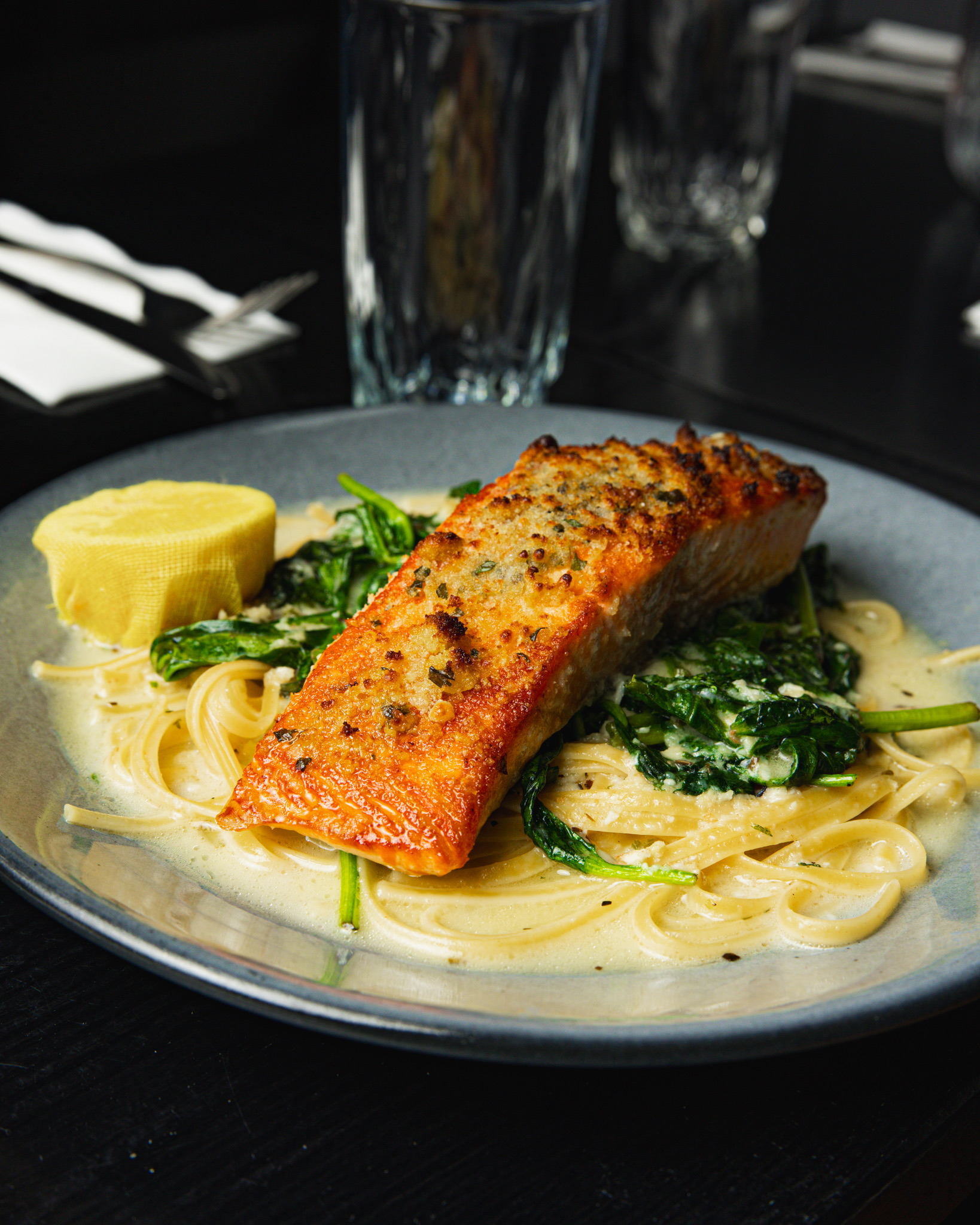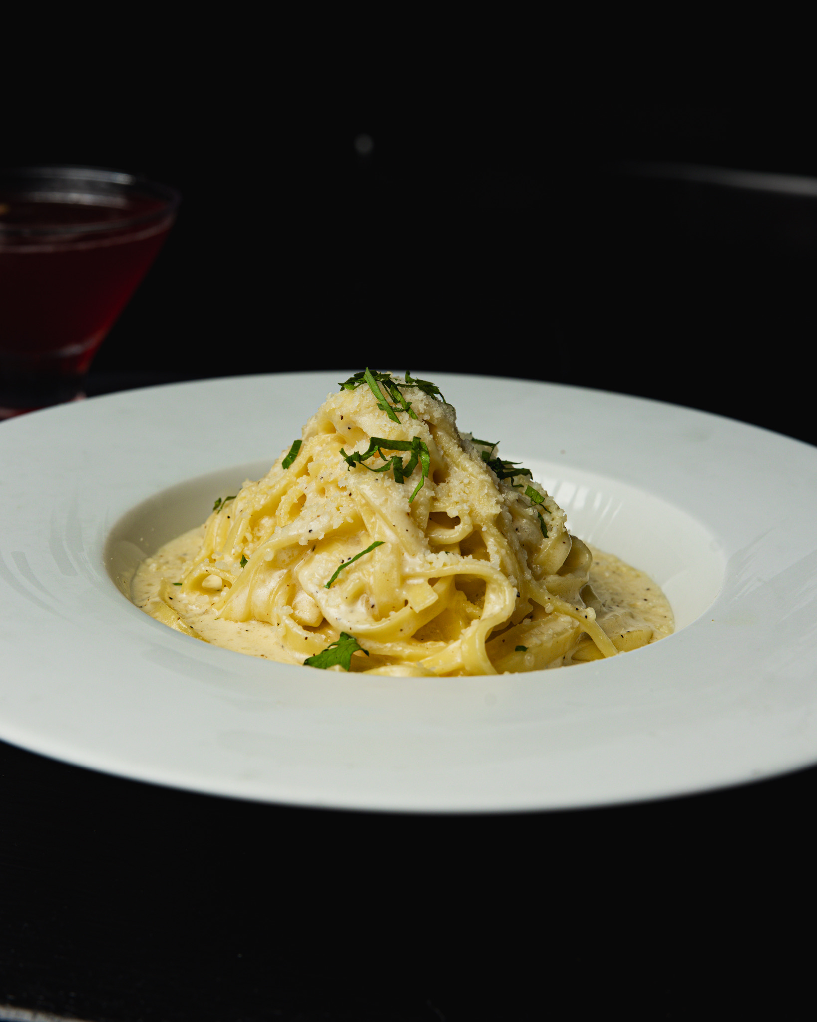 Fresh fettuccine pasta tossed with shallots, butter, white wine cream sauce, and cracked black pepper.