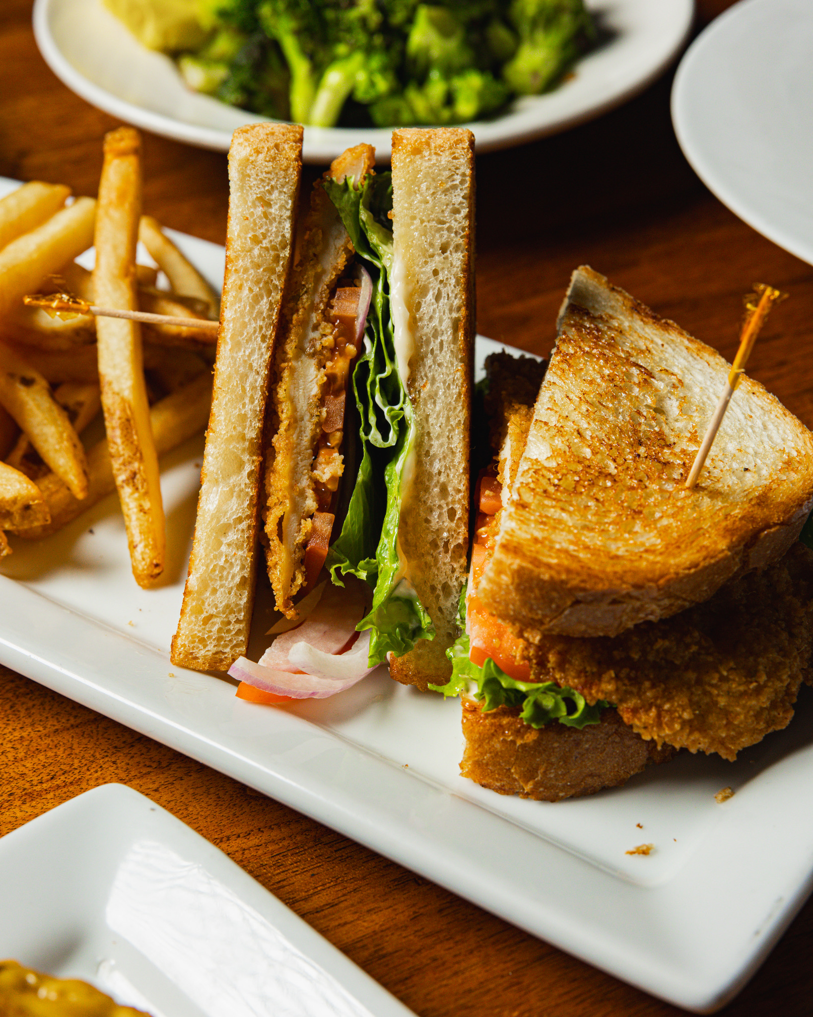 Buttermilk fried or grilled chicken served with lettuce and ECB signature sauce on a potato bun.